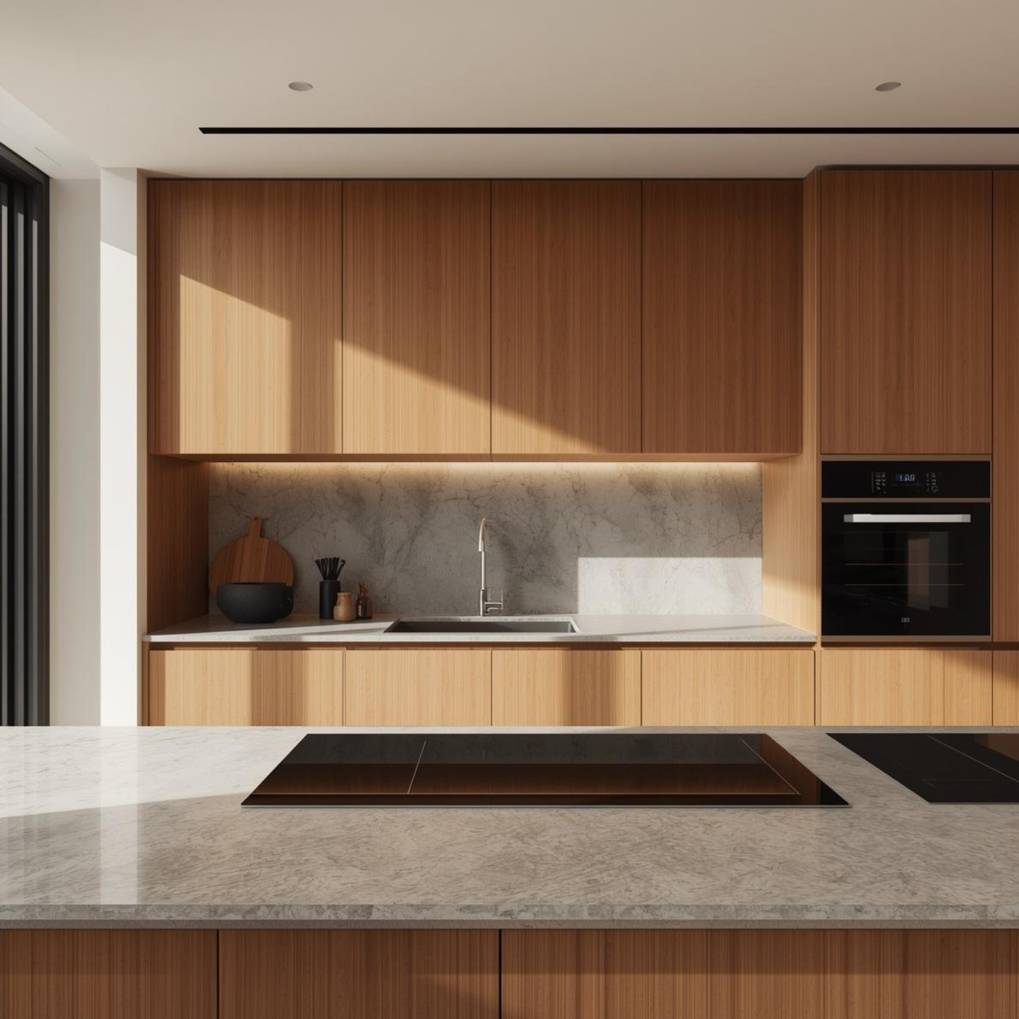 Moderne Elektrogeräte wie ein integrierter Kühlschrank, ein Backofen und ein Kochfeld bieten ein komfortables Kocherlebnis. Praktische Nutzbarkeit steht im Zentrum dieser Küche, die das tägliche Leben erleichtert und die Funktionalität erhöht.