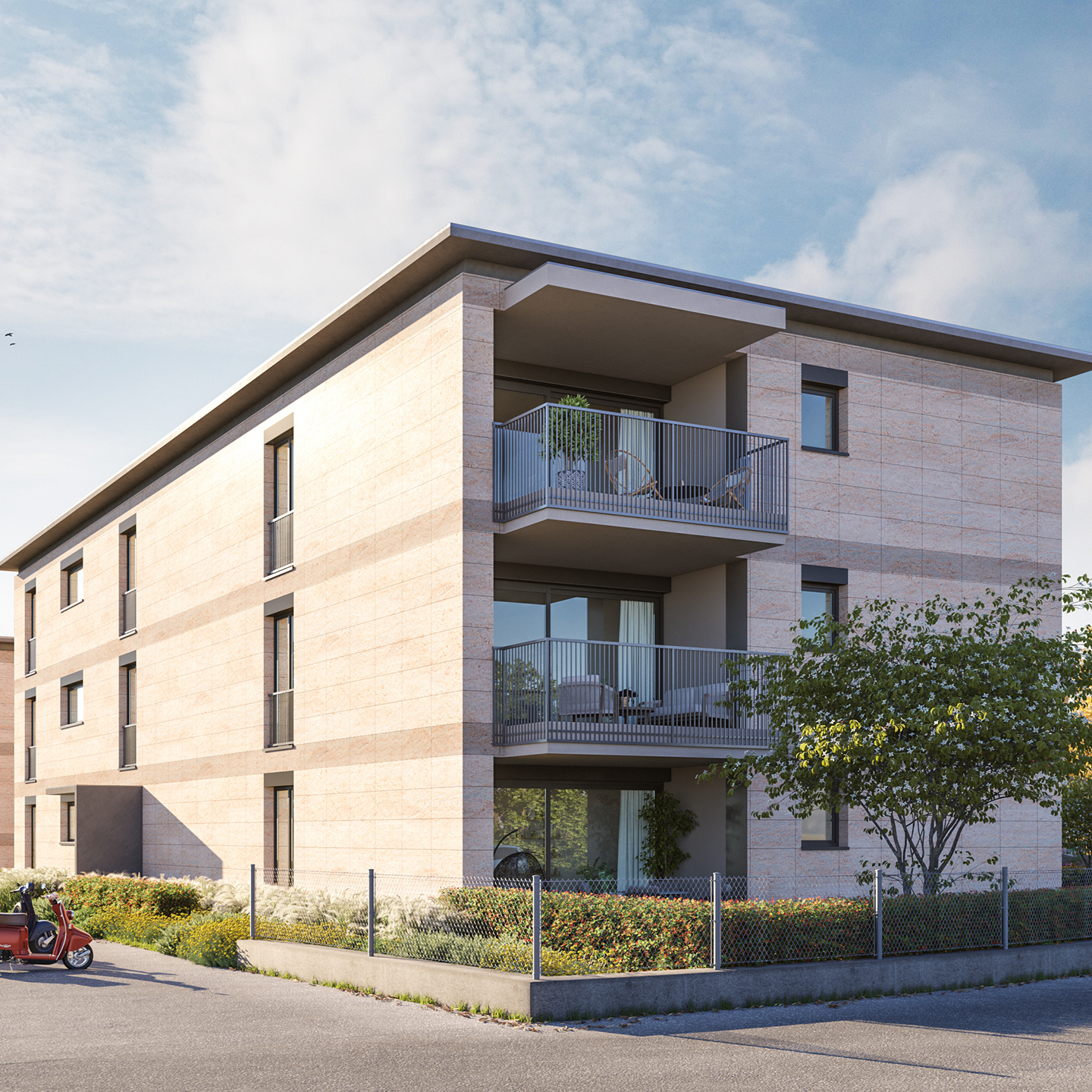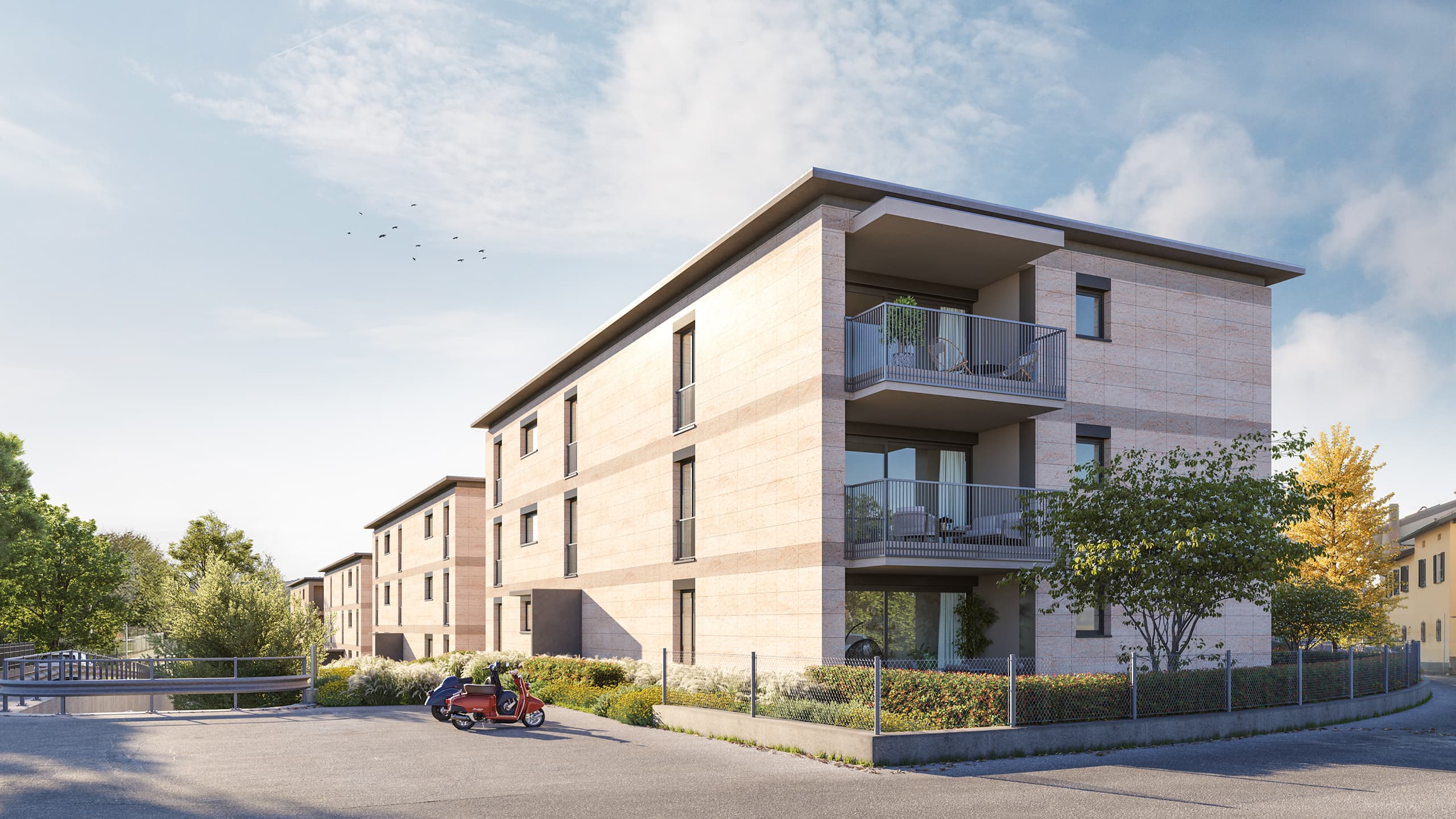 Auf der Parzelle Nr. 341 der Gemeinde Stabio entstehen drei Mehrfamilienhäuser mit insgesamt 27 Eigentumswohnungen. Die Gebäude erstrecken sich über drei oberirdische Geschosse und sind im Untergeschoss miteinander verbunden.